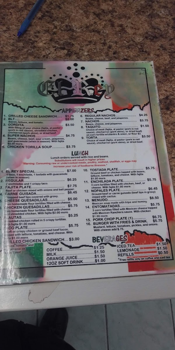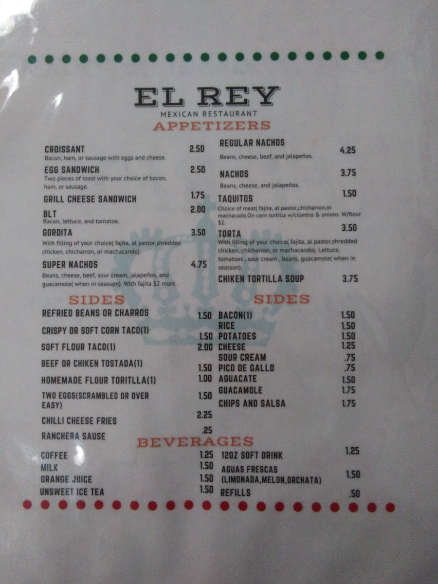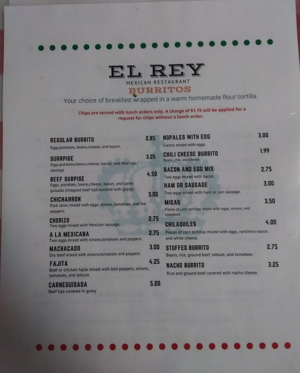 El Rey’s menu offers a straightforward, comforting experience that fits seamlessly with its relaxed, homey atmosphere. It features classic Mexican breakfast and lunch items, perfect for starting your day or enjoying a casual meal any time you’re in the mood for simple, satisfying flavors.
